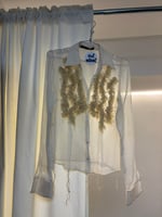priced as is - stain on sleeve and bottom front (can possibly be dry cleaned)